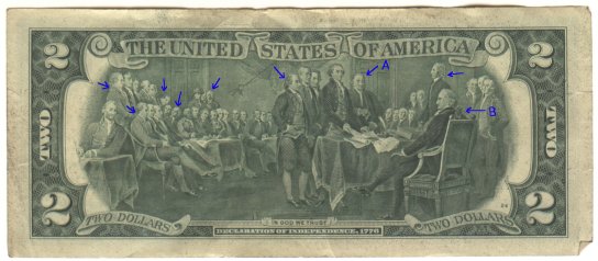 Arrows show those whose hair falls well over their collars, and some of them have ponytails. Quite a few of those that are not even marked have hair completely covering their ears. Signer "A" has hair falling well below his shoulders on both sides of his neck, and signer "B" has a long ponytail tied with a bow. All this is VERY evident with an actual bill under a magnifying glass.