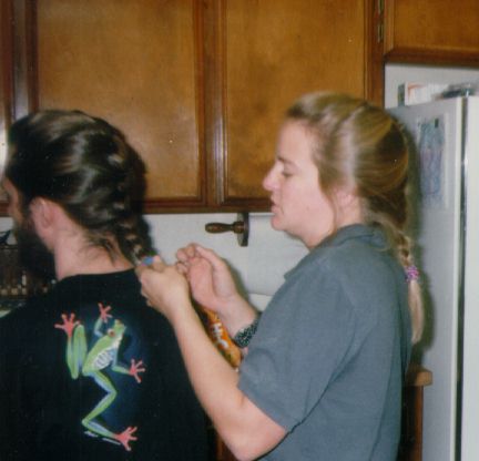 My ex-wife used to give me a French braid as well. Here's a sample. For some reason I really like this picture even though technically it's not the best. I think it's because it looks like the frog is watching Liza braid my hair.