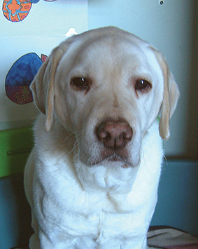 This picture was made on 2-26-05, when Moose graduated from doggie school. My hair is longer now, and so is his.