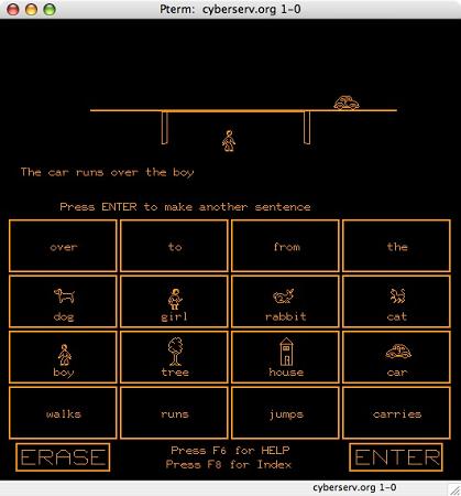 At one demonstration of PLATO, at Concordia University, in 1979, the lesson "sentences" was used. In this lesson, a kid builds a sentence by touching the words on the screen to make a meaningful sentence. If it is meaningful, an animation would enact the sentence. One smart-aleck six year old enters "The car runs over the boy", and the computer being litteral, simply shows a boy under an overpass, with a car rolling above him on the bridge, thus sparing the public of gore. The pictures were simple as you will see in the example.