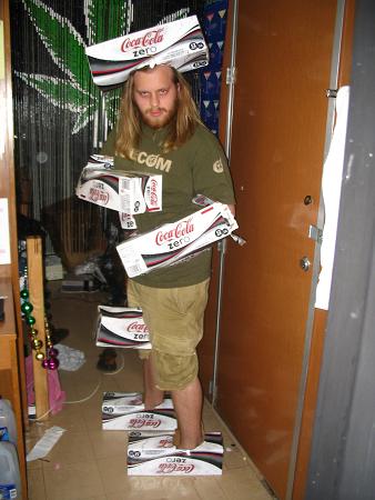My friend and I were messin around last night in my dorm, and using all of the empty Coke Zero boxes I had in my room that I hadn't thrown away yet, I made a super hero costume for myself..... Coke Zero Man!!! hahaahha
