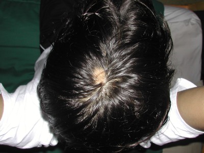 Not too long ago I found out that I had this bald spot on my head; since I cannot see my head too well (and my hair covers it), someone else tells me first, which is kind of embarrassing. Anyways it isn't MBP (does not run in my family either), and it is slightly reddened; rather it is ringworm of the scalp, as my doctor pointed out (contrary to its name, it is a fungus, not a worm).
