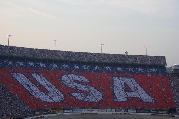 I took this shot just before they started the race on Saturday night.All the fans in that grandstand were given flash cards to hold up on cue.Looked kind of awesome.