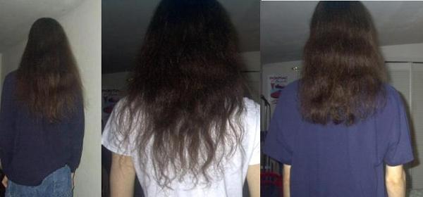 The second picture is from last night. About 2 and a half years ago I had the misfortune of having a female friend talk me into using a straightening iron which I became hooked on for about 2 months before finally wising up. The damage had been done though. On top of this, I started getting lazy and blowdrying my hair regularly for several months. Also, I stopped getting trims so the damage started travelling up the hair shaft.