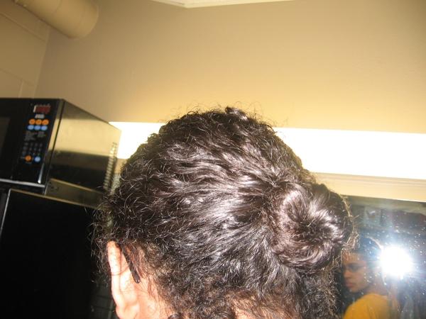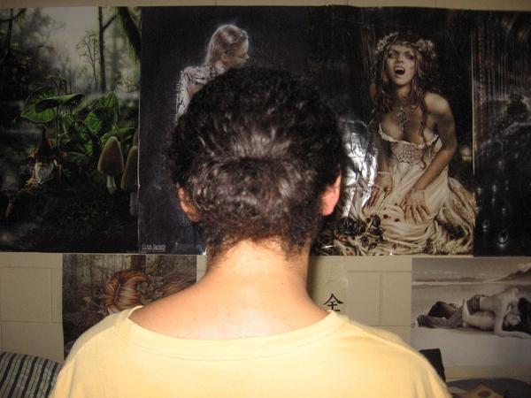 This is some kind of faux bun that my cousin always wears. It's like when you put your hair in a ponytail but bring the end back into the band; in this case, I didn't let the end of the tail hang out, and it creates a neater look. I love this style. This pic doesn't do any justice to it, though. Yes, I have many posters.