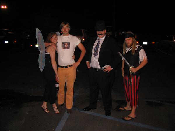 Here's a picture of my brother, two friends, and me right before we went to a HUGE Halloween block party :). The girl on the left is obviously a fairy, the guy next to her is Matthew McConaughey from Dazed and Confused, the next guy is my brother as a "corporate fatcat," and I'm on the left as a pirate (it was the cheapest costume they had at the store). We had SUCH a good time!!! :)