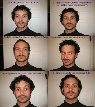 While, I must admit that I think the slicked-back picture does look OK, like you mentioned, the curls 'pop up' after a couple minutes of struggling against the gel. Also, now that the hair is about 4 inches long (uncurled), the back can't be gel-fastioned to look straigt and ends up being a large, curly, mullet-looking 'poof' at the base of my neck.