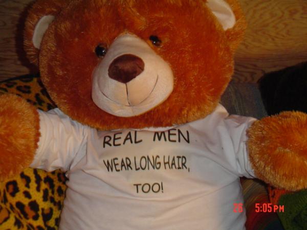 The bear is just a bear, BUT the message it sends is what is really great! Good for you for being the sort or person that has, for your parents, put long hair on men in a good light.