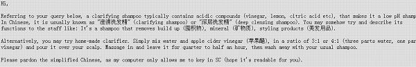 Referring to your query below, a clarifying shampoo typically contains acidic compounds (vinegar, lemon, citric acid etc), that makes it a low pH shampoo. In Chinese, it is usually known as "³ÎÇåô·¢¾«" (clarifying shampoo) or "Éî²ãô·¢¾«" (deep clensing shampoo). You may somehow try and describe its functions to the staff like: It's a shampoo that removes build up (¶Ú»ýÎï), mineral (¿óÎïÖÊ), styling products (ÃÀ·¢ÓÃÆ·).