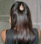 This is the picture that I was talking about in a previous post. This is alopecia areata. The hair grows back, but may fall again at any time. I have read that the immune system attacks the follicles and that stress may trigger this. As you can see in the picture, her hair looks very beautiful except for that one spot. In other pictures she has her hair brushed back and the spot is not visible.