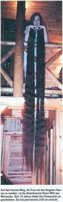 The German text under the picture reads, "Well on her way to becoming the woman with the longest hair is the American Diane Witt from Worcester (Mass.). For 15 years her splendid hair has not been cut. It is now 259 cm (8 feet, 6 inches) long."