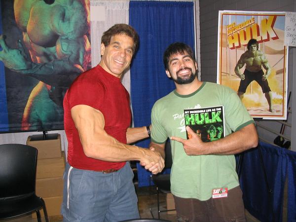In the summer of 2006, I spent a weekend in Chicago with my brother and an old buddy from high school. One of the events we hit was the Wizard World comic book/sci-fi convention. We arrived early in the morning, when there were practically no other people there. We walked into the main hall, and there was Big Lou, all alone, setting up his booth. I made a beeline for him, introduced myself, and told him that my very first memories of life are of watching him on t.v. when I was 2-years-old. We chatted for a bit, took a couple of pictures, and I bought both of his books. He gave me an autographed photo with each. Lou Ferrigno is an EXTREMELY nice man, a quiet and gentle giant, with a warmth of spirit that just pours off of him. This was definitely one of the high-points of 2006, for me.