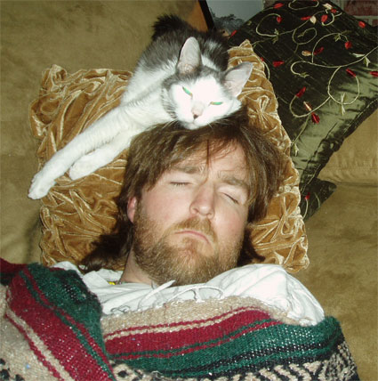 Great picture! One of my cats likes to lay on my head too...and has even tried to groom my hair a few times.