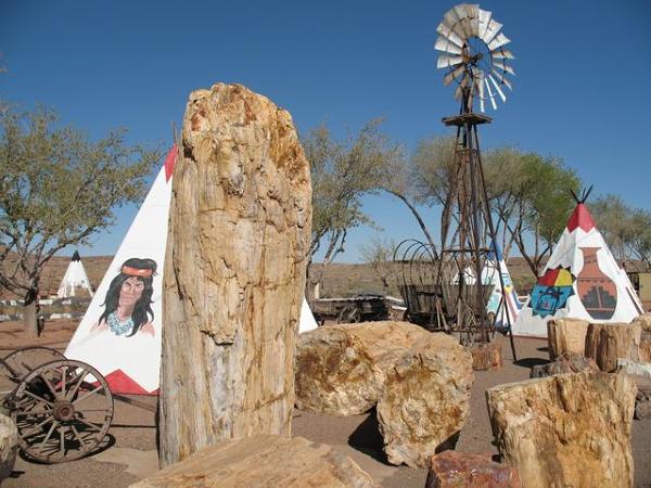 Later, in Arizona. Kitschy (sp.?) rest stop featuring the "worlds largest petrified tree". The man on the teepee seems appropriately discontent.