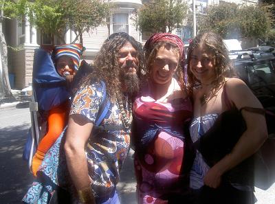 It was June 13, 2004. In the pic at the top of this post, Larry is wearing a tiedye he bought that day. I got the tiedye that landed on the front page of the Chronicle earlier this week from the same fair vendor, but I was carrying mine since I had my mushroom shirt on already. That was three years ago, so I can see I need to get some new hippie shirts!