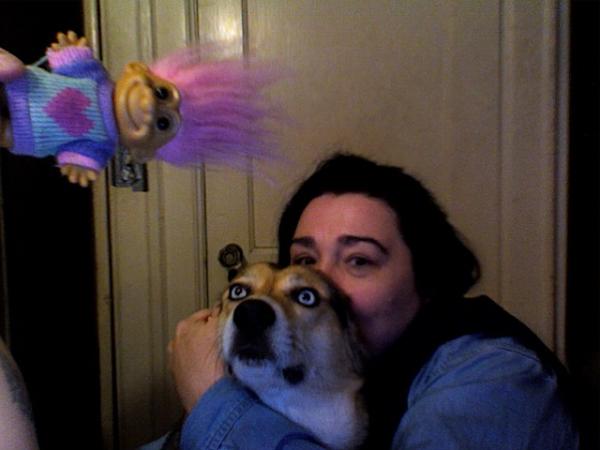 with our dog, Embla, a Huskie/Harrier mix, and a Wishnik.