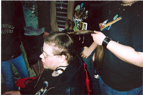 I ripped this from a friend's camera, it shows me when my hair was...attacked by a couple of my friends. For some reason, they love doing stuff to it. You can clearly see the shorter hair on the temples there...I'll try to find more somewhere.