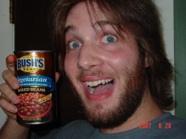 Hahah. Somehow, you look a lot friendlier. Maybe it's the can of beans. :D The hair (and growing? beard) look good on you man :-)