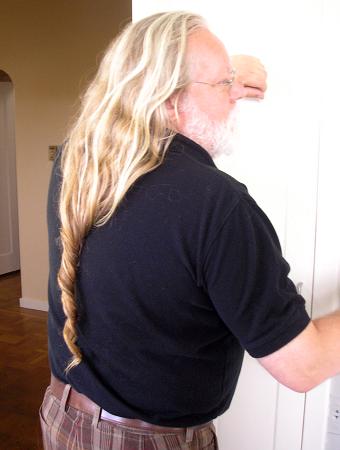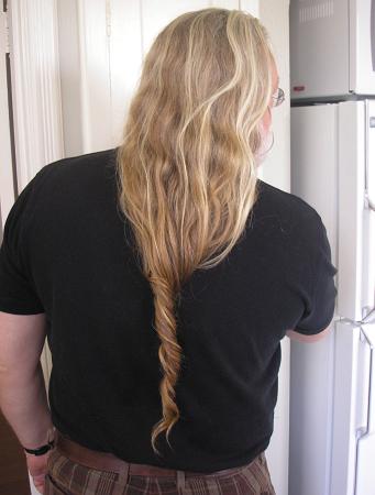 Hi Ken! So you had dinner with Bill as he left the chat last night for that get together.Well hope you all had a fun evening.Anyway thats a cool "twist" of a longhair style!Please pardon the pun.LOL.Certainly different that the usual array of braids mostly done as well as standard fare ponytails.Maybe you should get that patented since you did invent it!Looks very cool though and you certainly wear it well.Thanks for showing it to us board users.Now you'll have to top that one next time and think of a cool name for it too.The pressures on!LOL.Mark