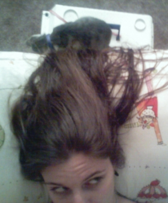 I had a dog who, like Christian's cat, would lick my hair obcessively, so that in the morning I sometimes had a pretty severe "cow" lick. I haven't had the pleasure or danger of getting my hair caught in anything other than my headset. I have a ways to go still.