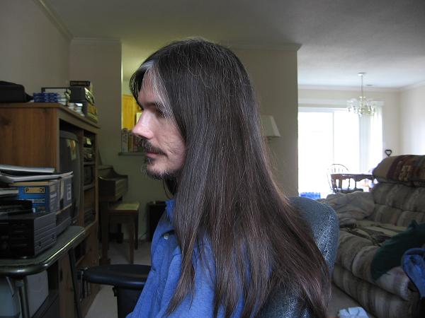Well, I hope the length doesn't annoy you for a long time, because your hair is looking amazing, and I imagine it would look great at about waist-length as well. But if you decide to cut back, I think this current length looks great on you. With the facial hair and the streak of gray, you look like a Spanish nobleman or a dignified pirate (is that an oxymoron?) or something.