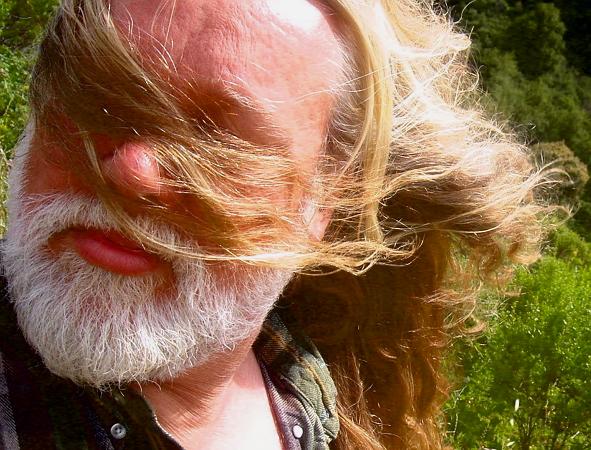OK, so I dug around in my iphoto library, and after cropping a lot off an old pic that I didn't feel was good enough to share very much, I ended up zooming in pretty close to the hair in this one.... It's not quite, "JUST hair"; but my hair pretty much wipes everything else out in view, at least! The photo was taken at the appropriately-named, "Windy Hill Open Space Preserve" in the Santa Cruz Mts. about an hour South of SF, in the Spring of '04.