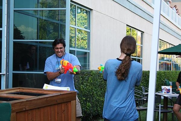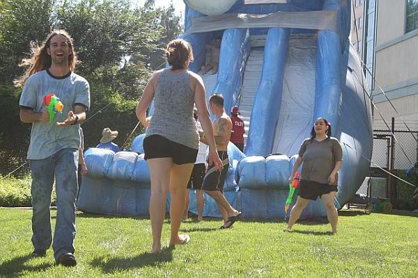 Hey, here are some pics from work yesterday, but they show my hair since I trimmed. We had a big water fight to beat the heat.