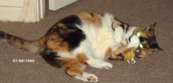 Sometimes I momentarily awaken in the wee hours of the morning, to hear the cat running madly throughout the apartment, chasing and batting toys around. The next day I may find bizzy balls under the furniture, mini-meece in the bedroom,and an occassional toy in the kitchen.