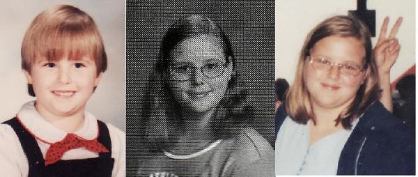 to be fair, dear David, I said I would post my nerdy pictures too....from L to R, me in kindergarden (when i actually WAS a good little catholic schoolgirl who was dumb enough to let mommy dress her) my freshman yearbook picture, and a picture from the next summer both when I was just 14, lol.