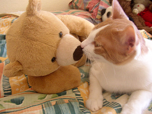 Cute cat, to return the favour, here's a pic of my 15 month old cat Gizmo, making out with a Teddy Bear.