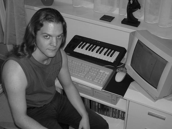 I took the colour out of the image because my eyes were red but I liked everything else about the image so this was the only way to get away with it. The computer is from 1997 and the little keyboard is from 2000 - possibly the first ever two octave MIDI controller ever, which you now see everywhere. Before this I used to use the computer keyboard to play the notes in. Kinda weird and cramped but I got reasonably good after playing that way for three years!