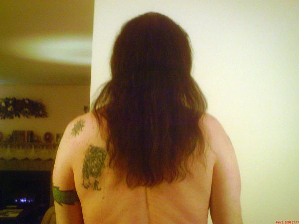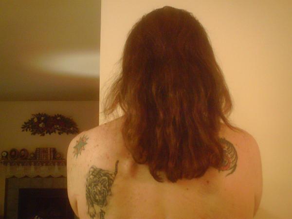 When I got the tiger tattoo, I decided that I'd be happy if my hair ever got as long as the bottom of it. It's FINALLY happened and I am so excited!!!! Of course, now my NEW goal is waist-length...maybe someday.
