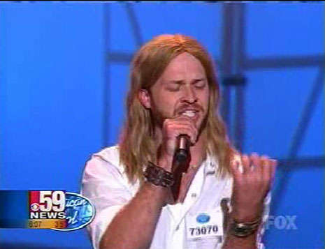 While watching American Idol tonight I kept wondering if "Rocker" Robbie Carrico has a longhair wig on. Check his front hairline around his part to see what I'm talking about. Does anyone see what I'm seeing?
