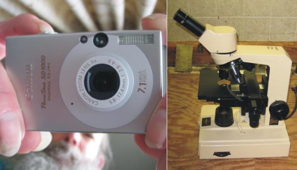 I use a lab microscope and a compact digital camera held up close to the eyepiece. The eyepiece has a measuring reticle. I used a drawing program to put the arrow and text in the photo