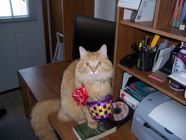 That looks like a purrrrrfect LOL-cats picture. I could see the caption, "Ah et all ur eastuh candy, and left u da empty baskeet" with that wide-eyed "I didn't do it" look that cats are SO good at.