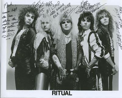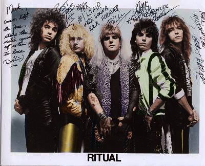 Phil what excellent research as that link is the Ritual I worked for.I can't believe its even on the net being its from so long ago and it wasn't like they got huge but they were popular on the club circuit.And they were from Livingston,NJ.At least Bill Farley was I remember for sure.Anyway just for the record I'll name the guys from left to right.Derek Lord,Ace Abram,Bill Farley(at center),Joe Ballarino, and finally Derek Thailer.During my time with them I kept Derek Lord's drum set from falling apart onstage during shows as he just beat on them big time.LOL.It was such a cool time being on their crew as they were a great bunch of guys.I always wondered what ever became of them.Thanks for digging up that info Phil.