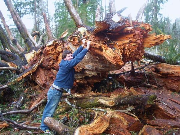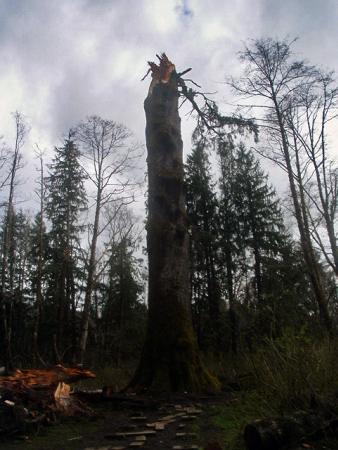 Oregons famous 700+ year Old Sita Spruce believed to be the largest and oldest in North America fell victum to the storm which I learned struck last Dec. 2nd. But it did not go without a fight! The hugh upper portion landed completely opposite of any other tree in the direction in which it fell. What you see still standing is extremely tall and has one "still living" branch attached just where the tree had snapped. And what is left of the tree still towers many many many stories high into the sky. What is most amazing is that so much of the inner wood was revealed as healthy despite what we were told by the State a number of years ago. The State has been proven wrong.