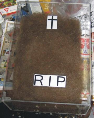 Why not give my shed hairs a decent burial. Here is my hair casket. I made this today out of acrylic plastic. Plastic fabrication is a hobby of mine. It is a big step above that ugly old paper shoe box.