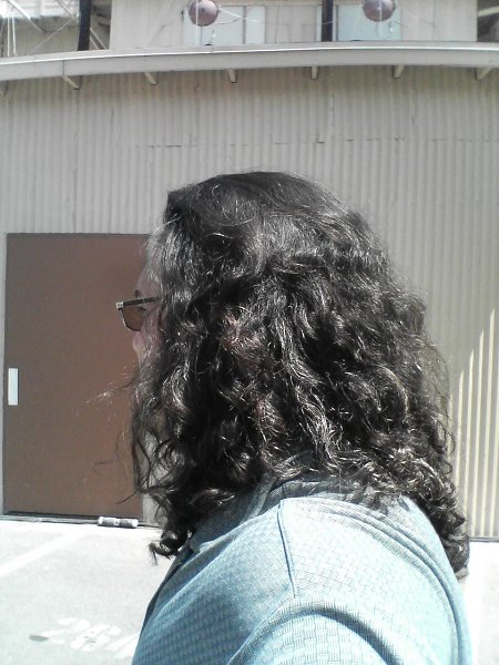 4) I use a lot of leave in conditioner. All this washing usually happens at night. The next morning when I wake up with a fro, I don't do any detangling or combing, because although curly hair may seem tangled, I think this is an illusion. For is it not apparent how curly and locks intertwine themselves and wrap around each other? That's just what they do. So anyway, now I just take leave in conditioner on the palms of my hands with some water and run it over the top of my hair and down the ends as if to make it into a tail. Repeat this several times rewetting my hands, and I end up with hanging ringlets that can then be tied back or left to dry for a rather nice looking presentation. One extra step to keep things tame is to chase the leave in conditioner with a drop of gel applied in the same way.