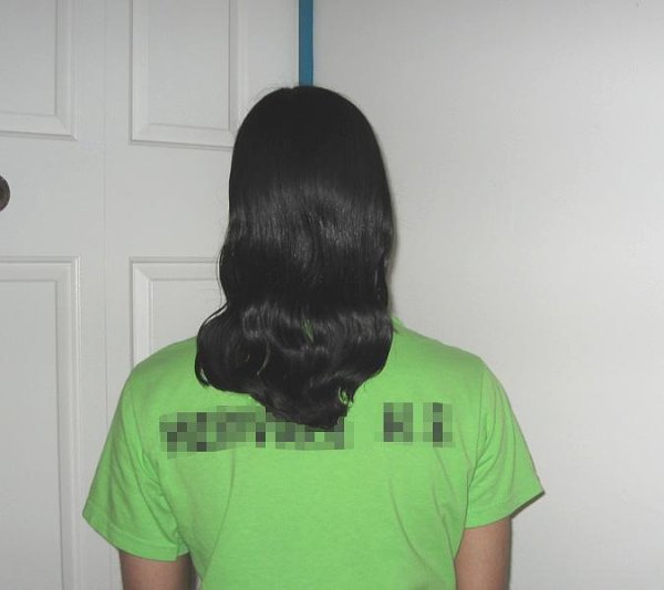 What I see in your hair photo posting looks very much as if the hair came from another source and was put into place over a photo of the back of someone else. In other words, to my own eyes this is the only time on this board that I have ever seen a posted photo that does not look convincing and for real. Naturally my apologies for I am probably incorrect(?). And of the lettering on the shirt in contrast to the hair. Quite a mystery in itself.