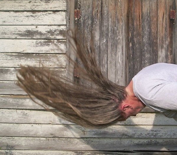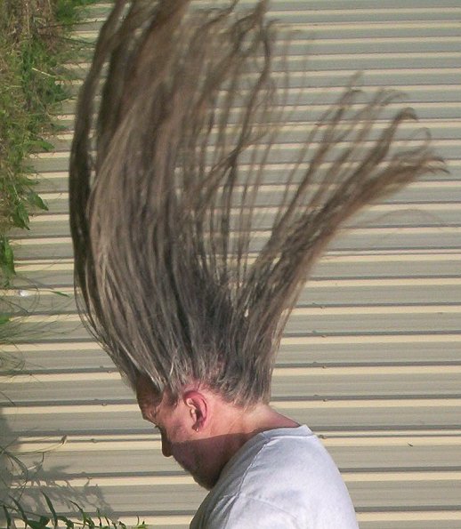 I was trying to do a similiar photo as the one you mentioned. It's hard as I am alone and using a camera with a timeer so I have to flip my head forward at the right moment. Here's a pic of when I was too quick and am lifting my head back as the camera snaps. Looks like my mane is trying to attack me. LOL