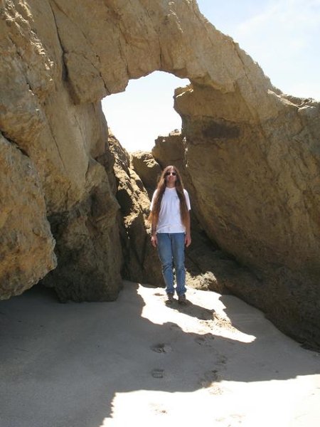 Me next to an arch formation, and I didn't even have to go to the desert. This one is on the beach, at an un-named location off highway 1 that a local told me was called "hidden beach".