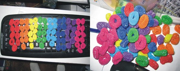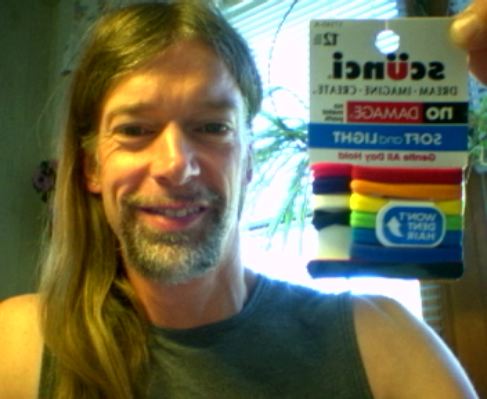 The good news is that fully 75 of the 150 rainbow hair ties in the bag have no metallized strips in them. They are on my keyboard. The other pile has metallized plastic strips in them. The metallized strips are a miniaturized version of Christmas tree tinsel. They are 1/3 of a millimeter wide and 40 microns thick. The thickness is half the diameter of a typical hair strand. It is questionable as to whether they really can cause damage, but until I am sure, I don't want to put my mane at risk. I have waaaay too many years of blood sweat and tears invested in my mane. (The "pink" ones are actually magenta. The flash makes the colours look lighter.)