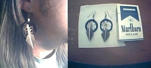Those are really cool. I like them (well, I like dreamcatchers in general) and they look good on you. I've concidered getting my ears pierced just so I could wear earrings like these myself, just haven't been able to bring myself to do the deed.