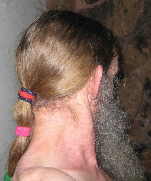 I usually keep my hair in a multi-segment tail like Scott's 24 hours a day, "refreshing" the tail each morning when I get up. What's it gonna be today? ...rainbow colors, alt black/white, random... ...