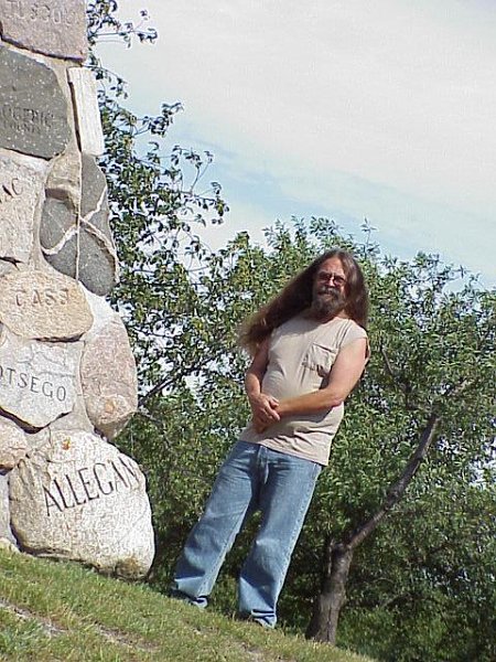 Hey folks, I appear to be sinking into the grass by the stones on the aptly named Cairn Hwy. Cool image I thought(Thanks John S)! The monument was dedicated in 1938 and features a stone from each of Michigan's 83 counties and marks the 45th parallel.half way between the Equator and The North Pole. Had a great visit with Bill and Larry.