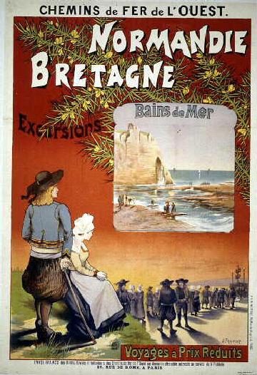Here is a colorful post-card reproduction of an ad for Chemins de Fer de L'Ouest, touting a vacation in Brittany France, as a place for eye candy :)