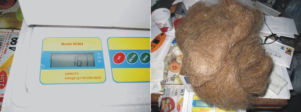 It contains about 6 years of shed hair. I need go to take a few minutes to weigh it. I'm back. Wow, it weighs a mere 167 grams, despite its great volume, which is about as large as my head. I took a photo, well actually 2. Here they are. Yeah, I know, I am a bit weird.