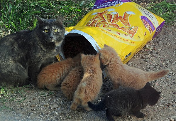 The attached photo is a shot of "Ming Chu" and five of her six kttens.....the "Calico Herd" now stands at 19...it is cat heaven here !