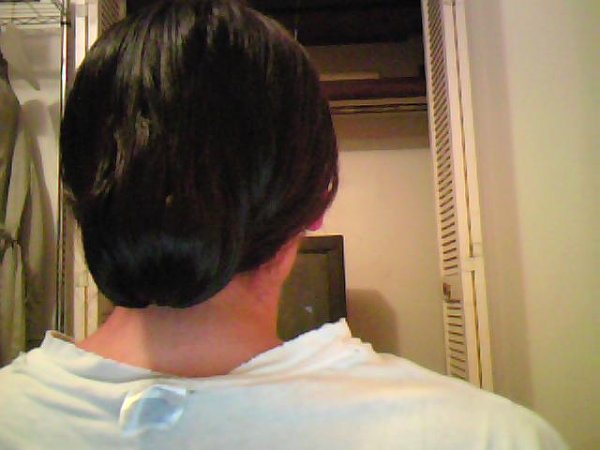 They told me to just try styling it so it is above the collar and as unnoticeable as possible, and if it brings up a red flag they'll just let me know about it and that would be that. That's just my plan for now. I spent today looking at ways to hide my hair and this is the best I can come up with. The front is okay, you'd never know my hair was long, but from the back it's just a giant puff of hair. It's just too long to try and hide without a hat. It looks ridiculous, but "above the collar."